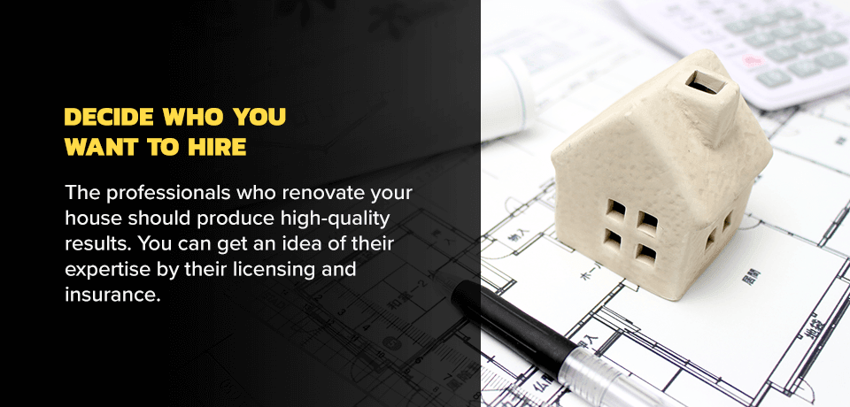 After you've decided what you want to do, you can create a realistic budget. You should make sure you're able to afford your home renovation before you take on the project so you don't run out of money. Decide on a number you're willing to spend and try to stick to it as you order materials and hire a contractor. Consider these factors when creating your budget:- The source of the money: You could either pay for the renovation with cash, take out a loan from the bank or use a credit card. Keep in mind that contractors often charge fees if you choose to finance.